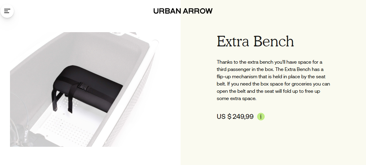 Thanks to this front extra bench your kids’ friends are always welcome to join! The Extra Front Bench for your Urban Arrow Family so you can carry up to 4 children.